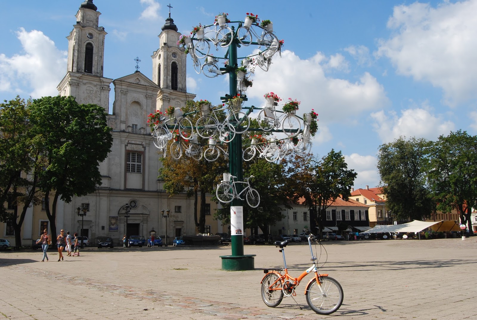 Met de oranje vouwfietsjes rijden we vanaf de City Camp naar het oude centrum van Kaunas.